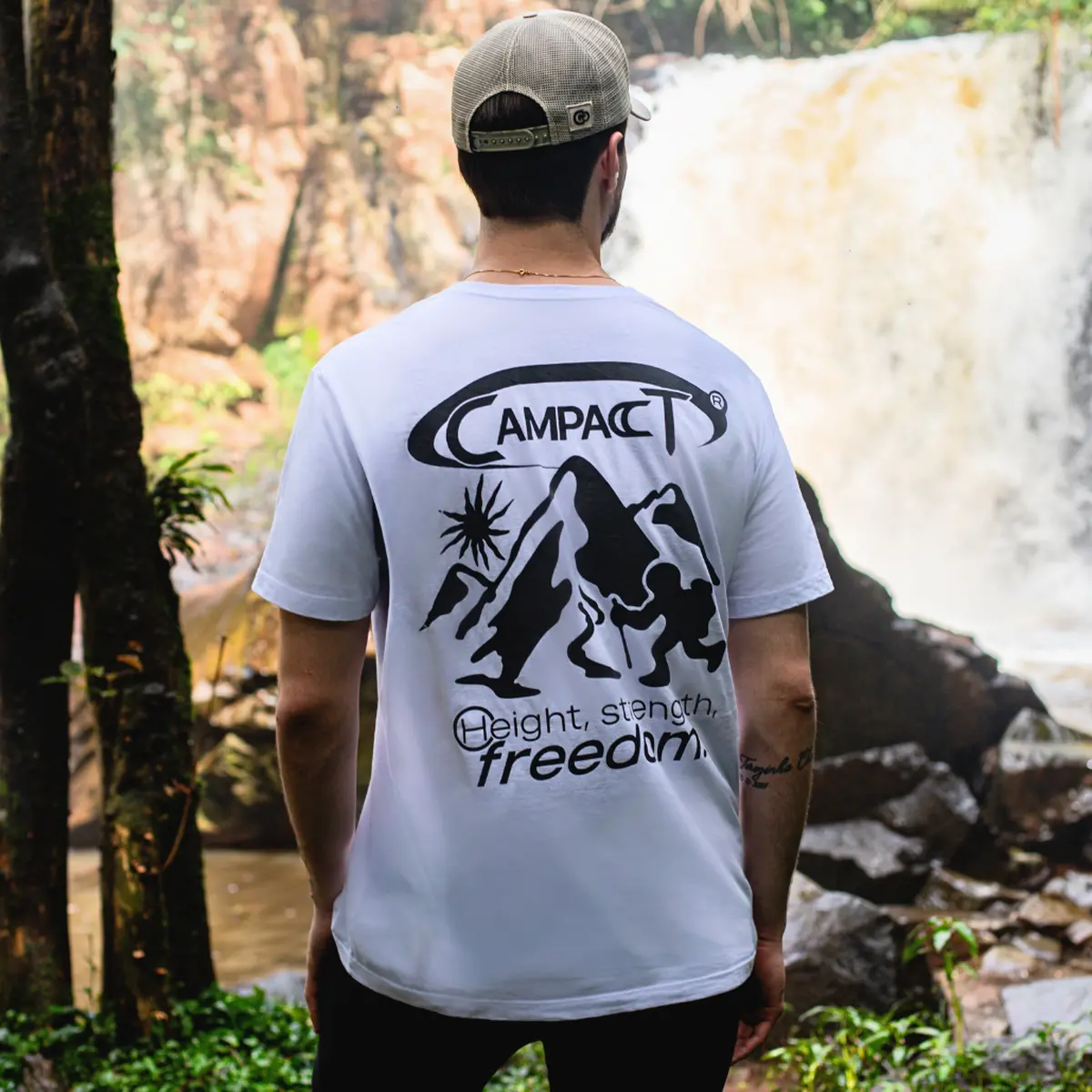 A montanha segue como símbolo do desafio. O sol marca energia e tempo. A silhueta em movimento representa quem escolhe avançar, passo a passo, carregando o próprio ritmo e propósito. A frase “Height, strength, freedom.” afirma o que sustenta cada jornada.